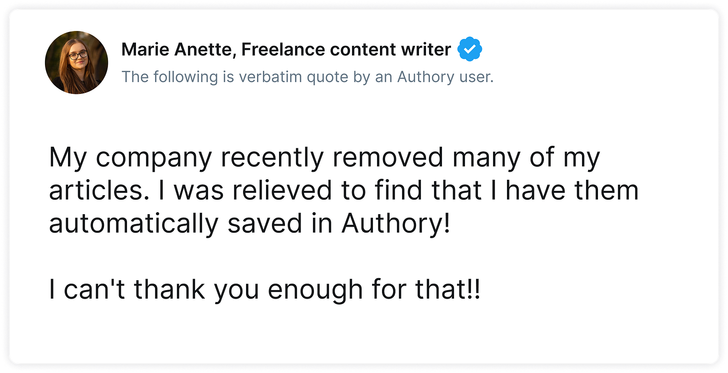 With Authory, that’s a nightmare you’ll never have to face. Authory automatically creates a portfolio that backs up everything you’ve ever written and will write, so your work is always safe.